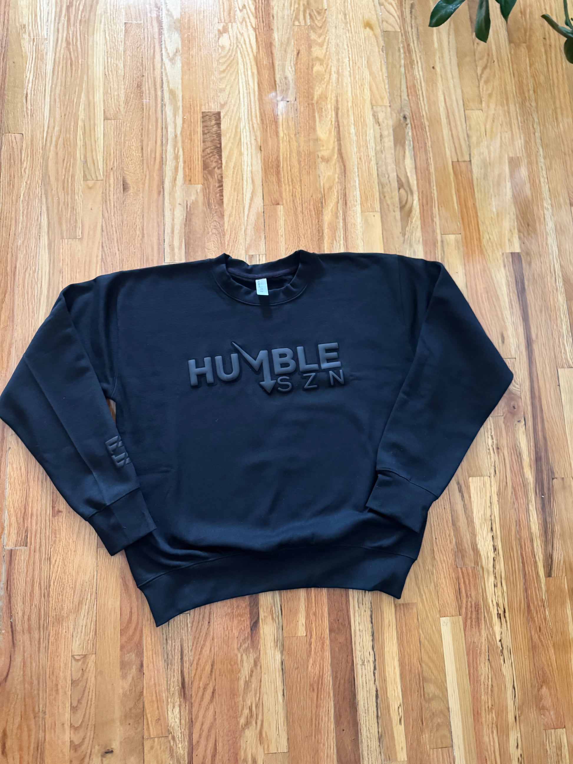 Introducing our BLACK ON BLAK CURVED HUMBLE SZN CHEST LOGO with suede texture velvet to the touch with FACEDTOFACE.CO arm logo Heavy Blend Fleece Crew Neck Sweatshirt the perfect combination of coziness and comfort! This sweatshirt is designed to keep you warm. The sweatshirt is made from a special blend of soft fleece fabric, providing a super comfy feel against your skin. It's perfect for staying extra warm on chilly days or when you're out and about. You'll definitely love the incredibly soft texture and pill-reducing ability of the cotton/poly fleece and the 9.0 oz. per sq. yd. plush fabric. It's perfect for keeping you warm and cozy!